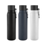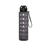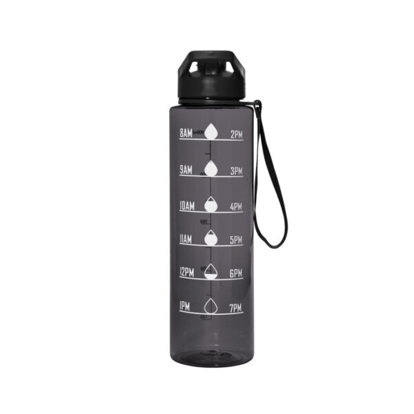 Botella con marcador de tiempo y medida. Color translúcido con tapa plástica flip top con asa, boquilla y correa del mismo color de la botella.