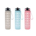 Botella con marcador de tiempo y medida. Colores pastel bitono en degradé con acabado frost. Tapa plástica combinada en color negro con un color de la botella. Apertura rápida, boquilla transparente rebatible y sorbete incluído. Correa del mismo color de la botella.