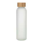 Botella de vidrio con acabado frost sublimable. Tapa de acero inoxidable, anillo de silicona antiderrame y correa reforzada.