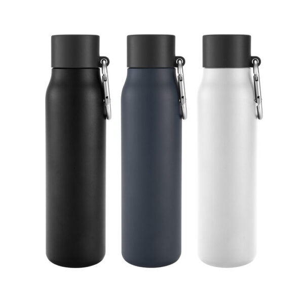 Botella doble pared, sellada al vacío. Interior en acero 304 reciclado y exterior en acero 201. Pintura powder coat (pintura más duradera y resistente a la corrosión y el paso del tiempo). Tapa plástica de polipropileno y anillo de silicona con mosquetón de aluminio. Mantiene hasta 12 hs la temperatura de las bebidas calientes y 24 hs de las bebidas frías.