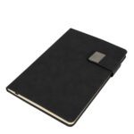 Deluxe Cuaderno tamaño A5 modelo «KEVIN», con tapas de Termo-PU negro mate de 650gsm, con 80 finas hojas amarillas con punteado «mental». Contiene cierre metálico imantado. Y banda separador de hojas color negro.
