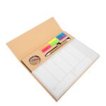 Set de Escritorio «ALTUS» en papel y cartón forrado. Contiene 10 clips de colores + 1 bolígrafo con cuerpo de papel reciclado (Escritura Azul) + 6 sets de banderitas adhesivas de colores + 100 hojas de 23.8 x 12.6 cm. con Planner semanal.