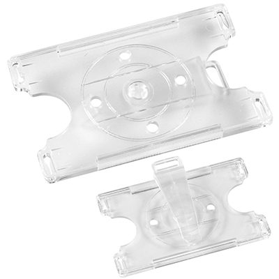 Para Credenciales tamaño Tarjeta de Crédito. Con clip giratorio posterior, para presentación vertical u horizontal.
