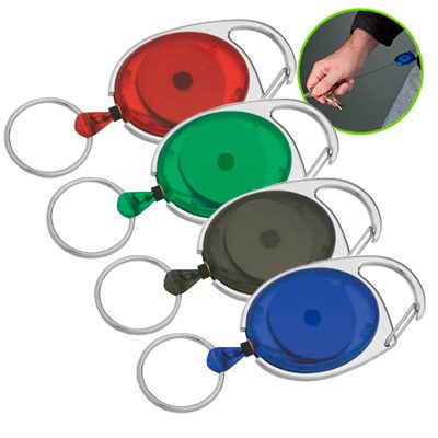 Llavero con Mosquetón y extensor retráctil, en color traslúcido.