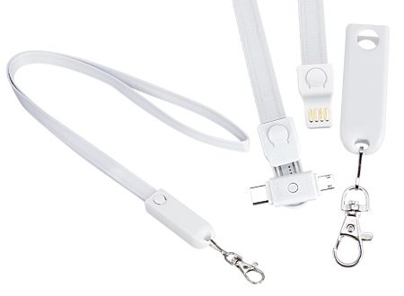 Connect Lanyard Multicargador, con terminal de carga USB y multicables Micro USB / i-phone / Type C. Incorpora nueva tecnología de cable cargador dual Micro USB y i-phone (en el mismo terminal). Compatible con dispositivos Android, Apple y Type C. Lanyard de poliéster de 90 x 1.3cm. Terminal plástico ABS blanco giratorio con tapa. Presentación en bolsa OPP con gráfica descriptiva. Producto con aprobación CE, ROHS, FC.