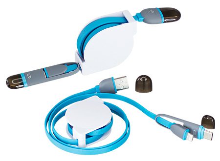 Connect Multicargador Retráctil, con cable de 1m de plástico engomado TPE de color, terminales de carga USB y Micro USB / i-phone / Type C. Incorpora nueva tecnología de cable cargador dual Micro USB y i-phone (en el mismo terminal). Compatible con dispositivos Android, Apple y Type C. Soporte plástico ABS blanco con amplia área de impresión. Presentación en elegante bolsa OPP con orificio para ganchera. Producto con aprobación CE, ROHS, FC.