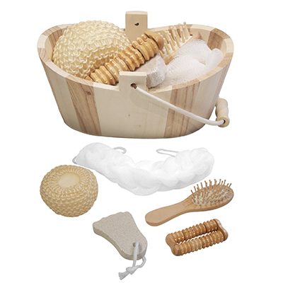 Canasto SPA de belleza en madera modelo “Naturals”. Contiene cepillo de pelo, esponja malla, masajeador de madera, piedra pomez y esponja de masaje corporal.