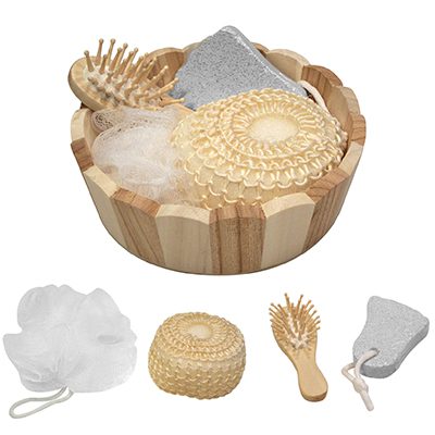 Canasto SPA de belleza en madera modelo “Naturals”. Contiene cepillo de pelo, esponja malla, piedra pomez y esponja de masaje corporal.