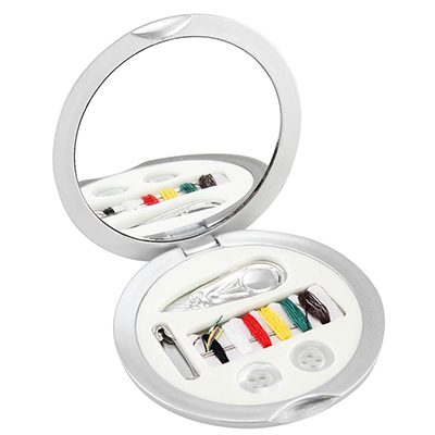 Set de Costura plateado redondo con espejo. Presentación en caja plateada de cartón.