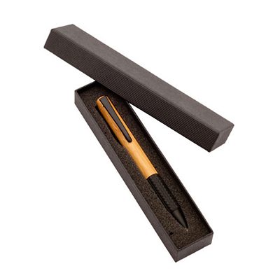 Bolígrafo Ejecutivo de Madera de Bambú, con terminales negro opaco. Refill plástico parker type. Escritura azul. Presentación individual en Estuche de Cartón plisado negro.