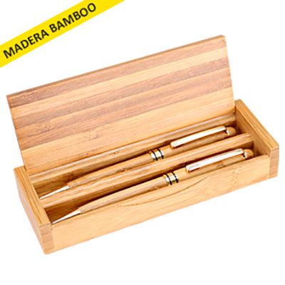 Incluye Bolígrafo tinta azul y Porta-Minas con terminales dorados, dentro de elegante Estuche de Bamboo sólido. Presentación individual en caja de cartulina reciclada color natural.