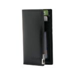 Billetera portas-tarjetas de eco-cuero negro, formato vertical, modelo «LICENSE». Contiene 8 compartimentos interiores. Presentación en bolsa frozen y caja de cartón forrado negro opaco.
