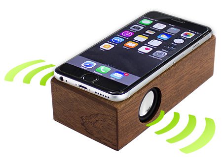 Parlante amplificador de sonido por Inducción, tamaño grande, de madera barnizada de Nogal. Ahora con mayor potencia y mejor calidad de sonido!! No necesita Bluetooth, Wi-Fi o conexión a cable. Amplifica el sonido una vez que se posa el celular sobre él, con un efecto de caja de resonancia. Compatible con cualquier modelo de teléfono celular. Contiene batería de ion-litio recargable incorporada. Incluye cable de sonido y cargador USB.