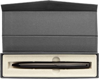 Metal. Cuerpo metálico mate. Clip de metal y puntera plástica. Apertura giratorio. Con elegante estuche. Pasta azul