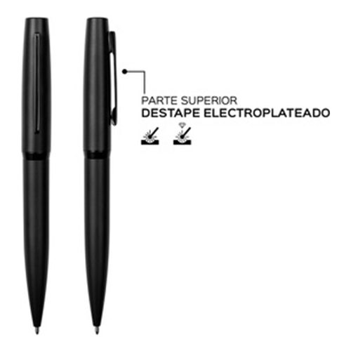 Metálico. Cuerpo color mate. Clip y anillo metálico. En la parte superior destape electroplateado. Apertura giratoria. Estuche de cartón. Pasta azul.