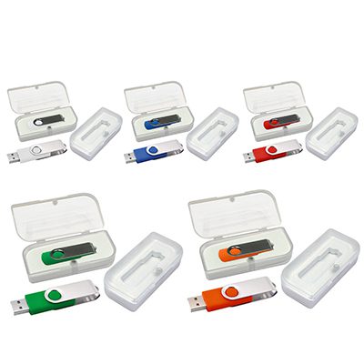 USB Pendrive con carcasa metálica de giro y cuerpo de silicona de color, de 4 GB de capacidad. En caja de PVC traslúcido.