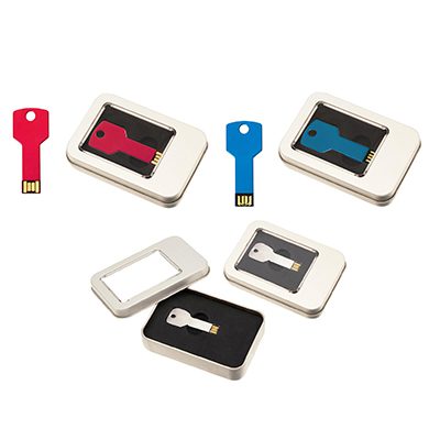 Pendrive de 4 GB de capacidad, con forma de Llave. Presentación en caja metálica con ventana.