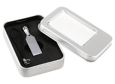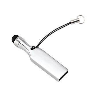USB Pen Drive metálico de 8 GB de capacidad, con puntero Touch-Screen y cordón para colgar. Presentación en estuche de Aluminio con ventana.