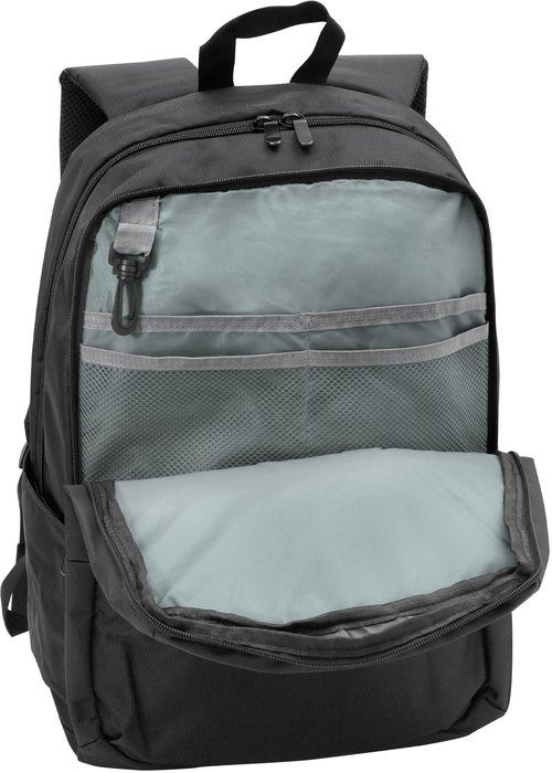 32 x 45 x 16 cm. Capacidad 25 litros. Poliéster 600D. Mochila Portanotebook de hasta 16″. Bolsillo frontal con cierre y dos bolsillos laterales para botella o Mug. Dos compartimentos con cierre. Compartimento principal con bolsillo porta notebook y documentos. Compartimento intermedio con cuatro bolsillos pequeños y gancho plástico en su interior. Estructura, espalda y correas acolchadas. Tiradores de cierres metálicos en color negro.