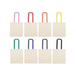 Bolsa reutilizable color natural con manijas de diferentes colores. Manijas cosidas de 70cm x 2,5 cm.