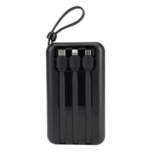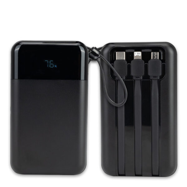Deluxe cargador Power-Bank USB con pantalla indicador de carga. Capacidad 20000mAh. Amplio espacio para logo. Input: DC 5V 3A / Output: DC 5V 2A. Viene con 3 cables incorporados: micro USB, Tipo C, i-phone. Incluye cable de carga USB / Tipo C. Incluye manual de uso en español e inglés. Presentación en Estuche de cartón forrado color negro. Producto con Certificaciones.