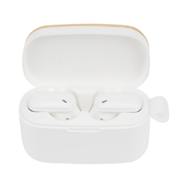 Audífonos auriculares inalámbricos en contenedor de plástico ABS color blanco con tapa de madera de bamboo, función Bluetooth Touch ID, puerto Tipo-C, emparejamiento automático, incluye par de protectores de silicona y manual de instrucciones en inglés y español. Presentación en estuche de cartulina KRAFT natural. Producto amigable con el medio ambiente.