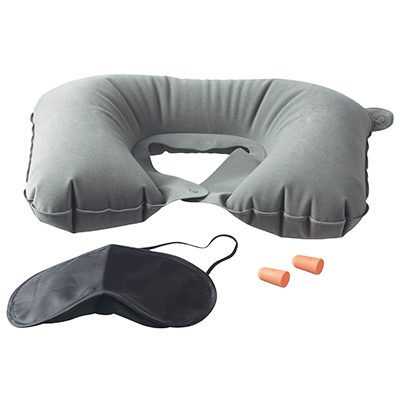 Kit de Descanso para Viajes. Incluye Almohada inflable cervical en tela aterciopelada, antifaz de microfibra y tapones de EVA para los oídos. Presentación en estuche aterciopelado.