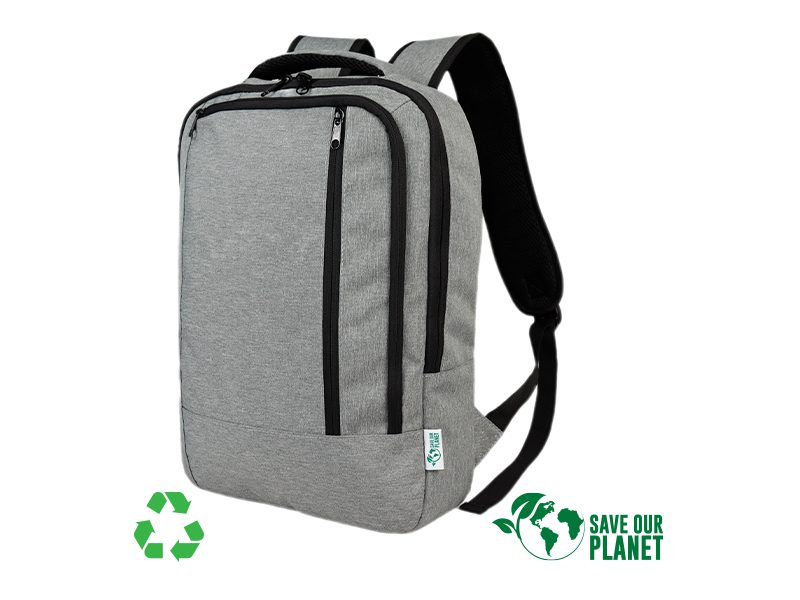 Mochila Porta-Notebook modelo “ECO”. Fabricada en material reciclado PONGEE-RPET bitono, eco-cuero 210D/PU y poliéster 300D/PU. Capacidad 12.5 litros, tamaño 30 x 41.5 x 10 cm. Incluye compartimento interior reforzado y acolchado para Laptop y doble bolsillo delantero.