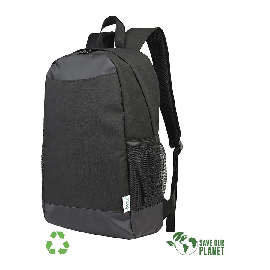 Mochila Porta-Notebook modelo «RPET». Fabricada en material reciclado RPET y poliéster 250D/PVC. Capacidad 20 litros, tamaño 29 x 48 x 14.5 cm. Incluye compartimento interior reforzado y acolchado para Laptop, bolsillo delantero y 2 bolsillos laterales con malla.