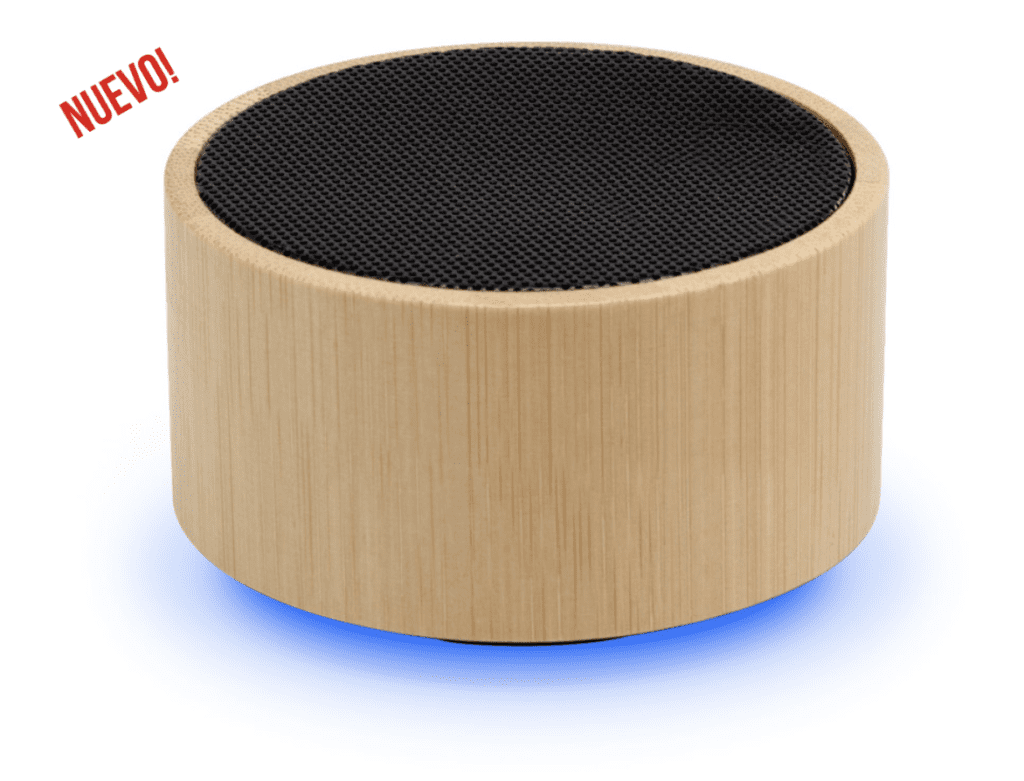 Ø7,5 x 4 cm. Parlante Bluetooth. Caja redonda de Bambú color natural con malla metálica en la parte superior. Base negra con panel de control. Permite recibir llamadas. Micrófono incorporado. Versión bluetooth: 5.0. Batería: 300 mAh. Potencia: 3W. Cable de carga y conexión USB tipo C en color negro. Presentación en caja de regalo Kraft.