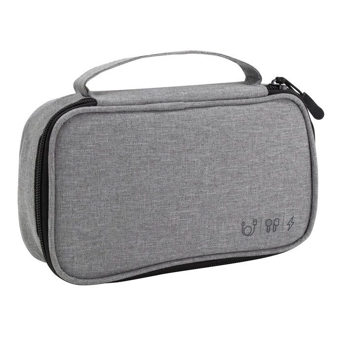 20 x 12 x 5,3 cm. Poliéster 300D. Organizador de cables. Estructura acolchada. Asa para transportar. Compartimento principal con cierre con tirador engomado. Interior forrado. En uno de sus lados cuenta con un bolsillo principal y dos pequeños de red, y en el lado contrario tiene un elástico con velcro multipropósito.