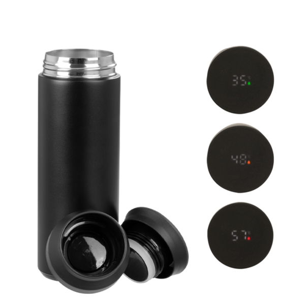 Botella térmica metálica doble pared aislante, cubierta de Polipropileno (PP) acabado mate, interior Acero inoxidable 304 SS, exterior Acero inoxidable 201 SS, modelo «SMART LID». Incluye doble tapa rosca de plástico PP negro, con sello cilíndrico de silicona, sistema de filtro circular y termómetro digital en la tapa superior, que marca la temperatura del líquido interior. Capacidad 480ml. Producto BPA FREE, para el contacto con líquidos y alimentos. Presentación en bolsa plástica transparente + caja de regalo de cartón laminado negro.