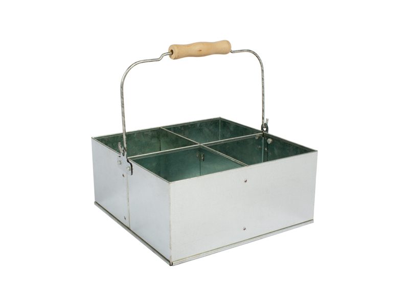 Canasto con 4 compartimentos interiores, fabricado en Acero Galvanizado de 0.35mm de espesor. Con asa metálica y mango de madera de pino. No incluye tapa. Ideal para poner velas o guardar accesorios metálicos, plásticos o de madera. Botellas chicas y vasos de vidrio, latas de bebida o cerveza.