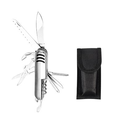 Cortaplumas de Acero Inoxidable con 10 funciones. Incluye funda de tela negra + caja de regalo plateada.