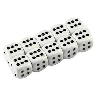 Dado de juego, extra-blanco, con puntos negros. Presentación en paquetes de 10 unidades.