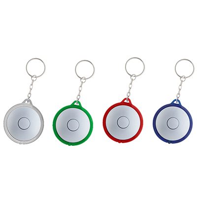 Llavero-Linterna LED redondo, con cuerpo plateado y anillo (borde) de color traslúcido.