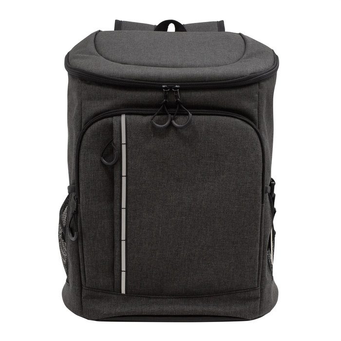 43 x 29 x 18 cm. Capacidad 18 litros aprox. Poliéster Wulong 300D + Interior forrado en PEVA color plata con relleno de espuma de PE. Mochila cooler. Compartimento principal con cierre en la parte superior. Compartimento frontal con cierre, bolsillo interno de red con cierre y bolsillo externo vertical con cierre y banda reflectante. Dos bolsillos laterales de red multipropósito. Incluye destapador de botellas de acero inoxidable (6,3 x 3,3 xm) extraíble. Correas regulables acolchadas. Cierres metálicos. Tiradores de cierre plásticos en forma de U de color negro.