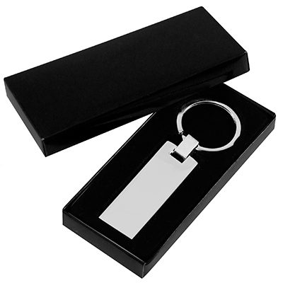 Llavero Metálico Rectangular Plano. Presentación en estuche laminado negro con cuna aterciopelada.