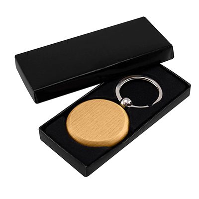 Llavero Redondo de Madera de Bamboo. Presentación en estuche laminado negro con cuna aterciopelada.