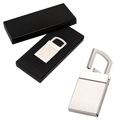 Llavero Metálico modelo “Lock”. Presentación en estuche laminado negro con cuna aterciopelada.