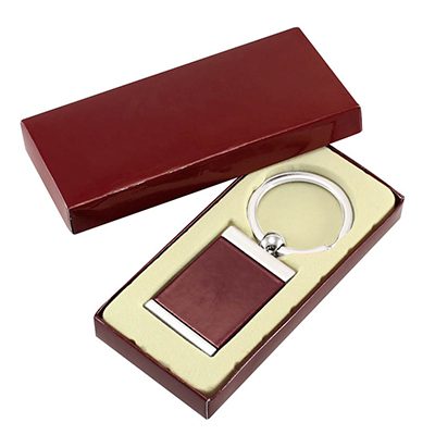 Llavero Metálico con cuerpo de madera barnizada café moro. Presentación en estuche laminado café con cuna aterciopelada.