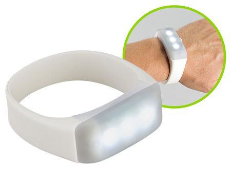 Pulsera de Silicona blanca, con 3 luces LED blancas. Función luminosa fija y estroboscópica. Ideal para deportistas. Presentación en cajita de cartulina blanca.