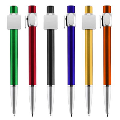 Bolígrafo “Badge” con cuerpo de color metalizado y clip cuadrado plateado, ideal para imprimir isotipos. Escritura azul.