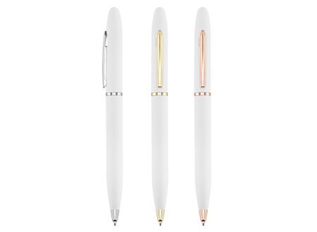 Fino bolígrafo Metálico blanco modelo “Trooper”, con terminales metálicos. Diseño simple y moderno. Escritura azul.