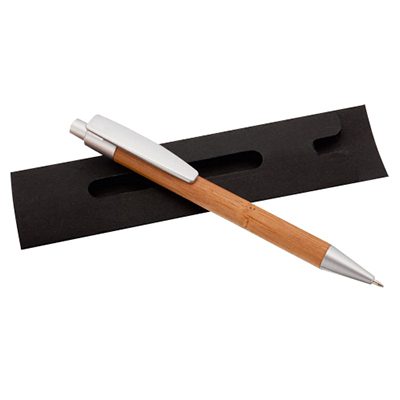 Bolígrafo de Madera de Bambú, con terminales satinados. Refill plástico parker type. Escritura azul. Presentación individual en Estuche de Cartón reciclado.