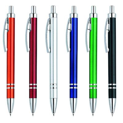 Bolígrafo plástico “Arco” con cuerpo de color metalizado. Escritura azul.