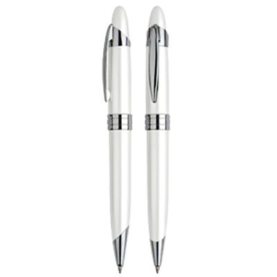 Bolígrafo metálico modelo “White Pearl”, con terminales cromados plata. Escritura azul.
