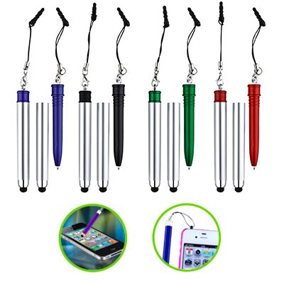 Bolígrafo “Touch-Screen” con tapa plateada y goma posterior negra para pantalla táctil. Incluye práctico soporte plástico para insertar en la salida de auricular del iPhone. Escritura azul.