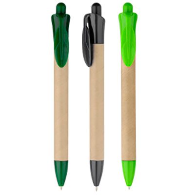 Bolígrafo Ecológico “Leave” con cuerpo de cartón reciclado y clip plástico PET biodegradable con forma de hoja. Escritura azul.