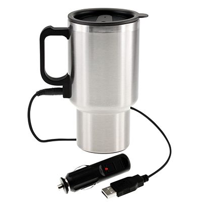 De acero inoxidablede doble pared aislante con tapa plástica negra y dosificador. Con conector USB y al cenicero del automóvil.